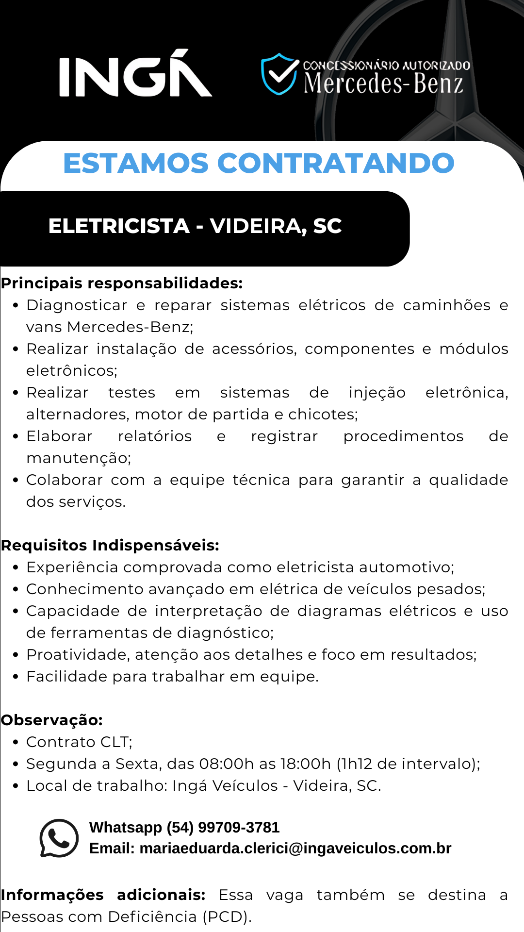 Faça parte de um dos maiores concessionários Mercedes-Benz do Brasil em Videira, SC! Procuramos um Eletricista automotivo (período integral) que queira acelerar sua carreira em um ambiente inovador, com toda estrutura, equipamentos de ponta, e capacitação constante.